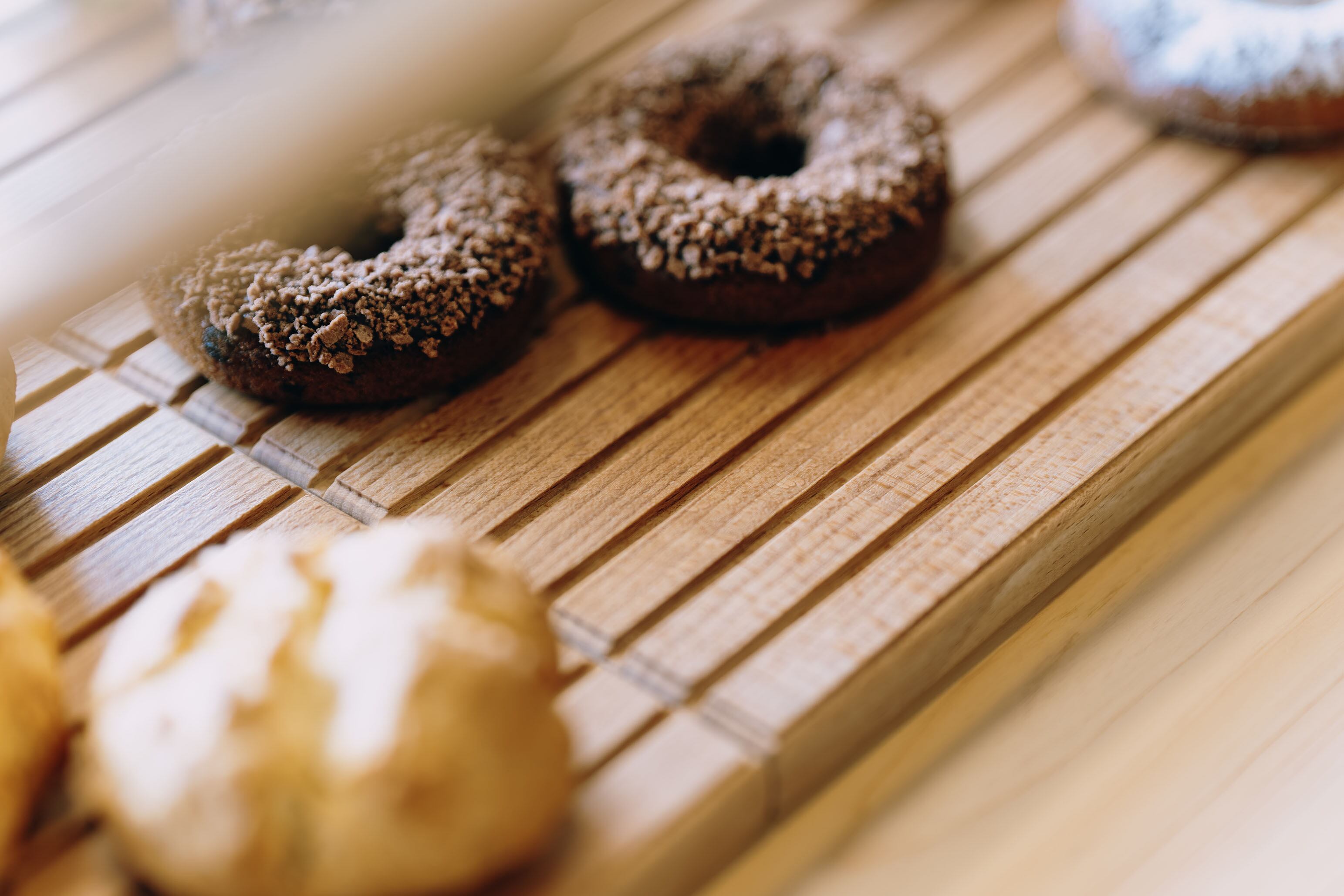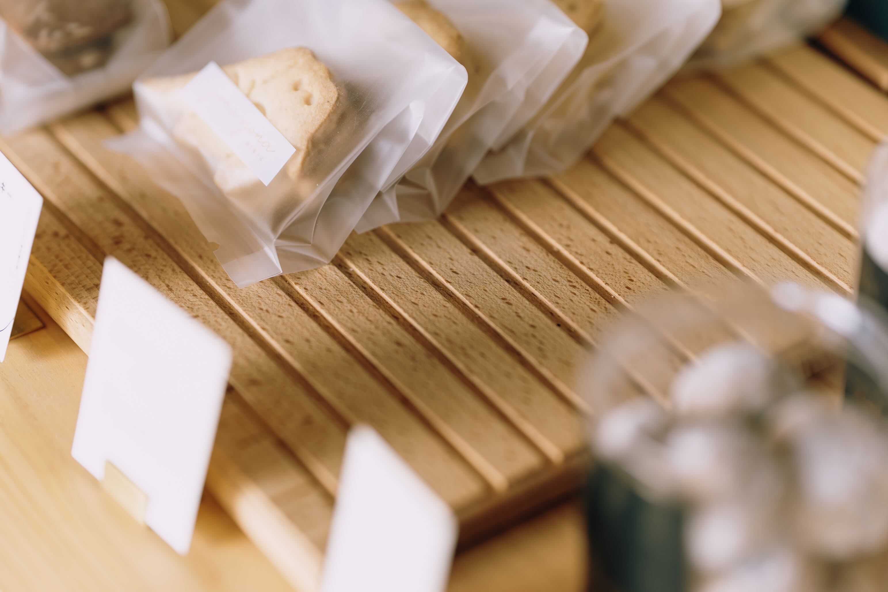 表面に施したストライプ状のスリットが、並べたお菓子やパンをさりげなく引き立てる、主張しすぎないけれど、空間にほどよい表情を与えるデザインです。
